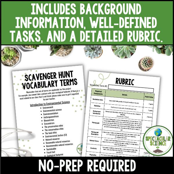 The Environmental Science Photographic Scavenger Hunt Project is a dynamic and immersive resource that invites students to create an illustrated Environmental Science glossary using original photographs to depict essential concepts and terms from the course. With the flexibility to span one month, one semester, or the entire school year, this project brings Environmental Science to life by encouraging students to explore and observe the natural world around them. By immersing themselves outdoors, students become Environmental Scientists, directly connecting theoretical knowledge with real-world observations.